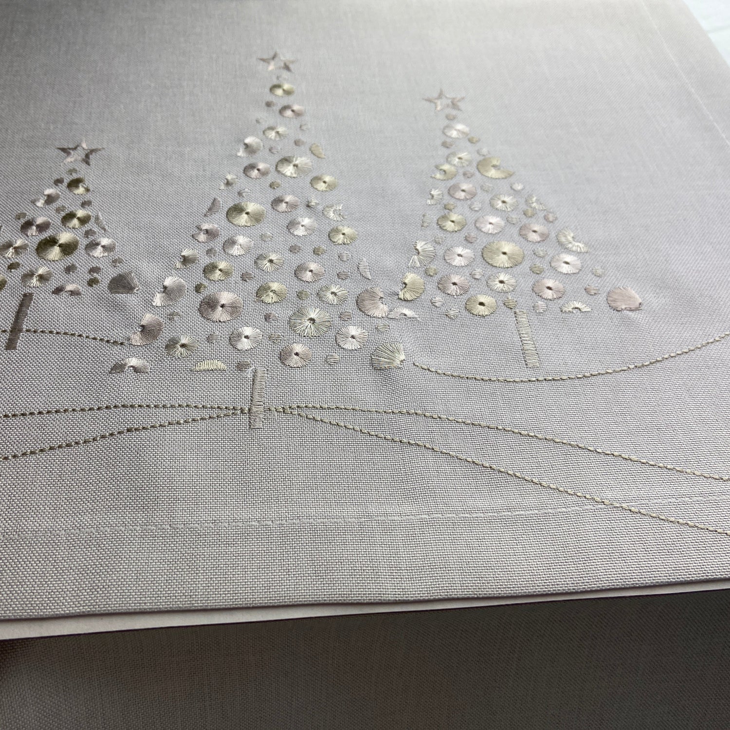 Decorative Table Runner by Walton & Co. This beautiful table runner in a pale linen colour with embroidered Christmas trees in the same colour. 100% polyester.