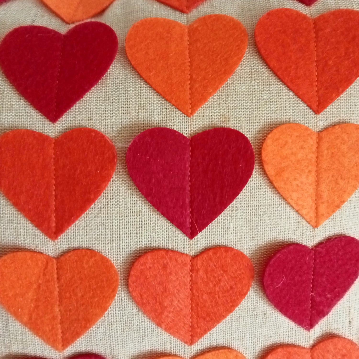 Hearts Cushion by CIMC. This beautiful filled cushion by CIMC home set on sand coloured jute fabric with 3d hearts in orange and red in a felt feel fabric, piped in red. 75% jute, 25% cotton, decoration 100% polyester, filling 100% polyester.