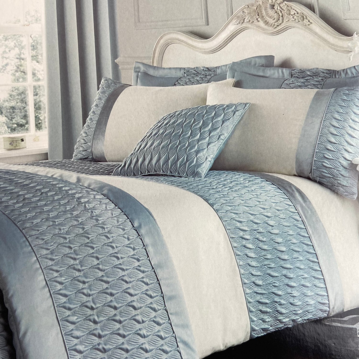 Quilted Luxury Satin Duvet Set by Catherine Lansfield, luxurious beautifully designed bedlinen with sumptuous velvet and embroidered detailing in tranquil tones of duck egg and cream. 50% cotton 50% polyester with 100% polyester matt satin & 58% cotton 42% viscose velvet trim.
